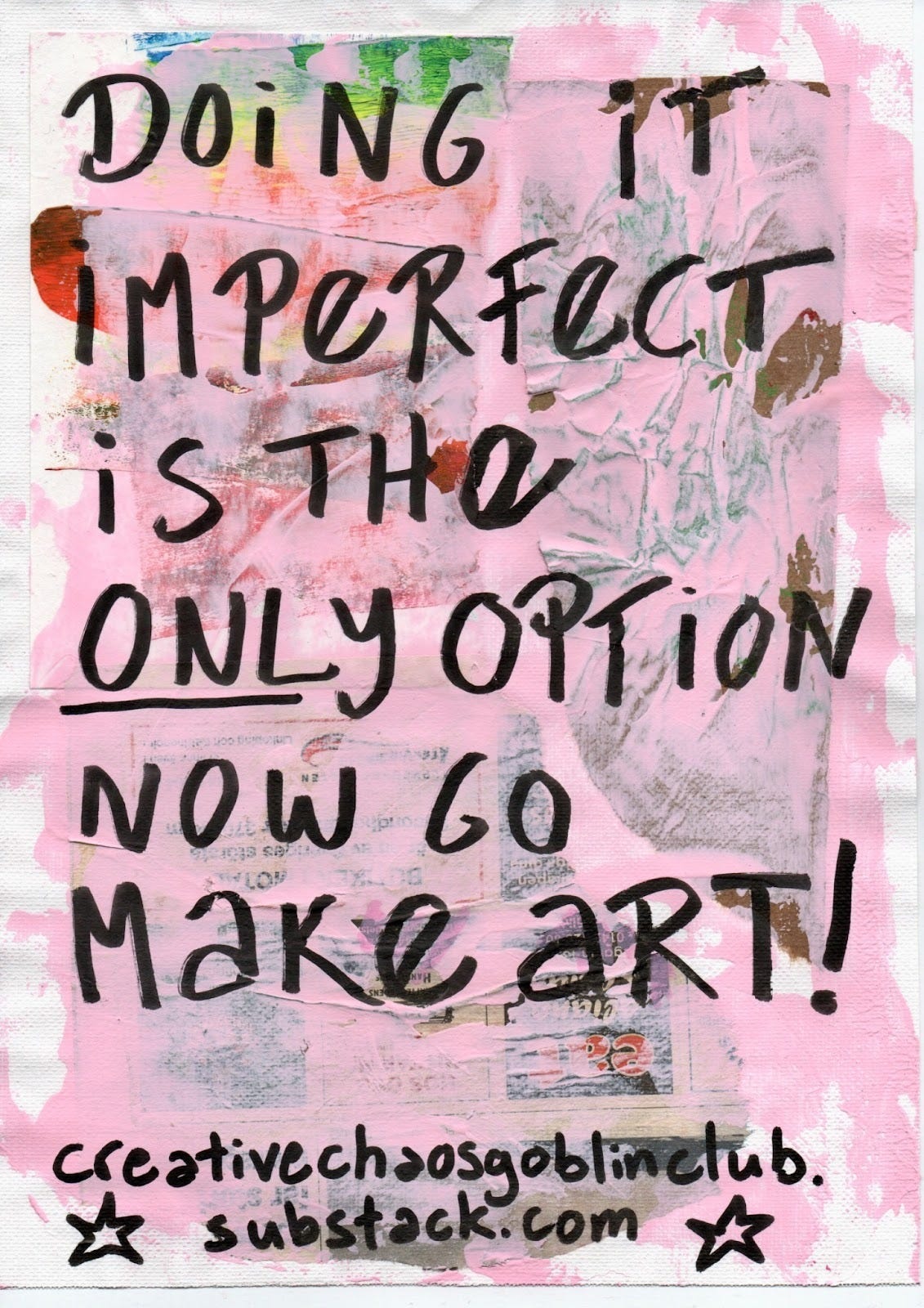 when you become a member of the creative chaos goblin club, you’re saying YES to all the parts of you that are messy, and “too much”, and weird, and cringe. you start playing by your own rules and stop shaming yourself for not fitting the image of “perfect artist” that you’ve internalised. proudly claiming the label chaos goblin is a way of saying: i’m valid as a creative right now, in the mess, in the multitudes, with dirty dishes in the sink and five different projects on the go. for me, it has meant giving myself permission to be myself. it’s been extremely affirming and joyful. and i’m just getting started!