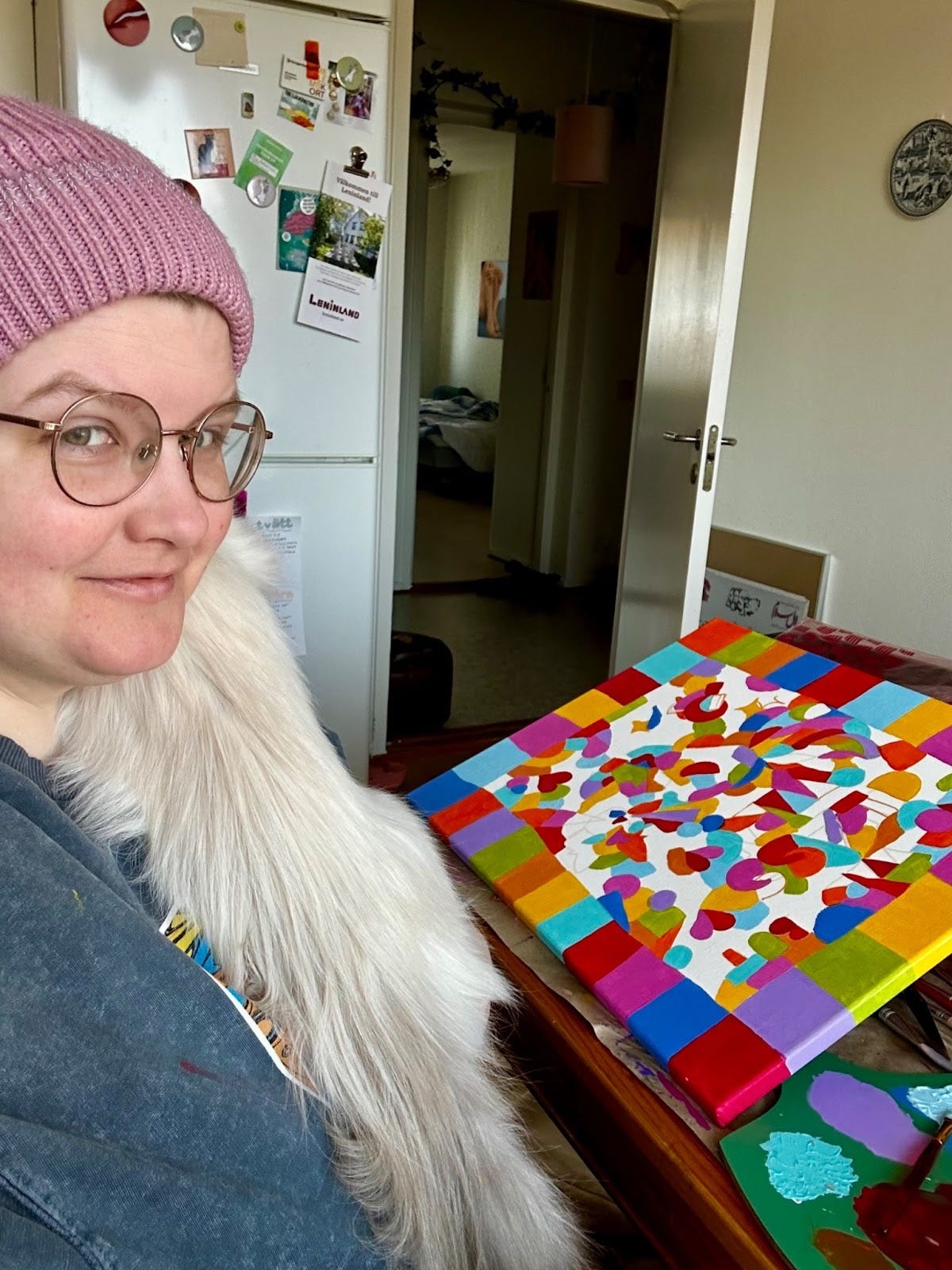^possibly the most chaos goblin image of me that exists: making a big garish painting to kill the priest in my head that told me i was having “too much fun” painting colourful cats during my 100 day project last year, expert chaos goblin narya in my arms, and the mischievous look on my face. and if you look through the doors in the background you can just make out my unmade bed.