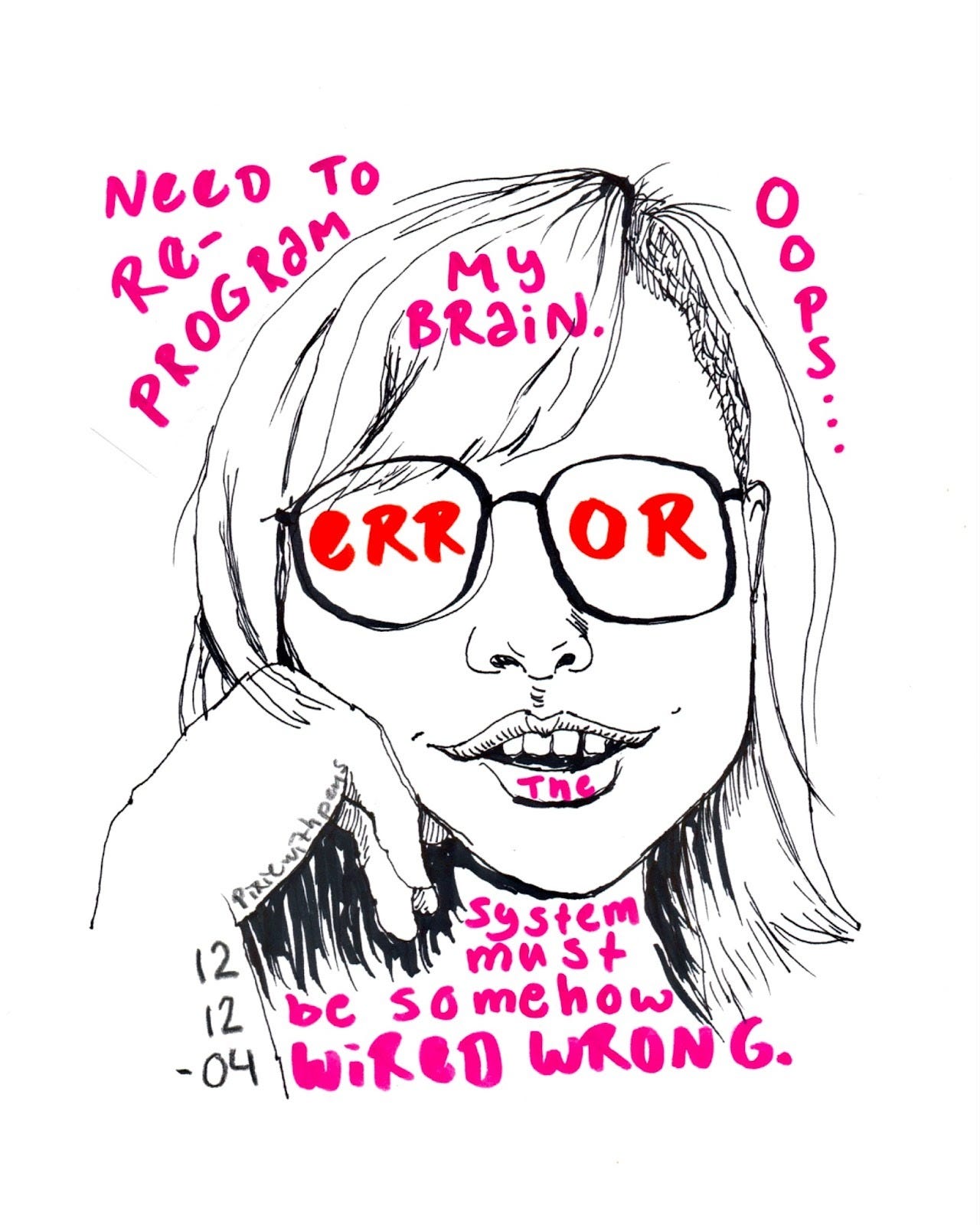 ^a drawing from the autism chapter of the diary book! every chapter has a different art style, because of course that’s how a chaos goblin artist sustains momentum on a huge long-term project. (yes i also have ADHD.)